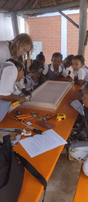 Construction d'un séchoir solaire et préparation du séchage des fruits. Les « Colibris » ont suggéré le dessin le chariot avec 5 cadres séchoirs et ont financé le matériel. Les enfants ont monté ce séchoir à fruits, bien utile en cet automne austral.